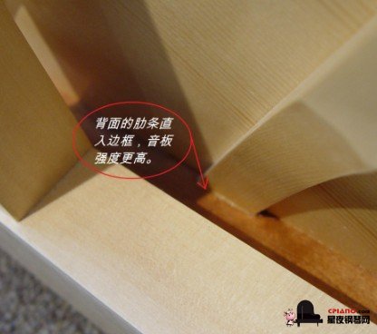 5,音板背后的肋條,能增強音板的強度,高質量的鋼琴會用全尺寸的肋條,并且兩端會嵌進外框里頭,低質量的鋼琴的肋條一般會跟外框離1英寸左右或者更短。立式琴在琴后背部察看,臥式琴在琴底下察看。